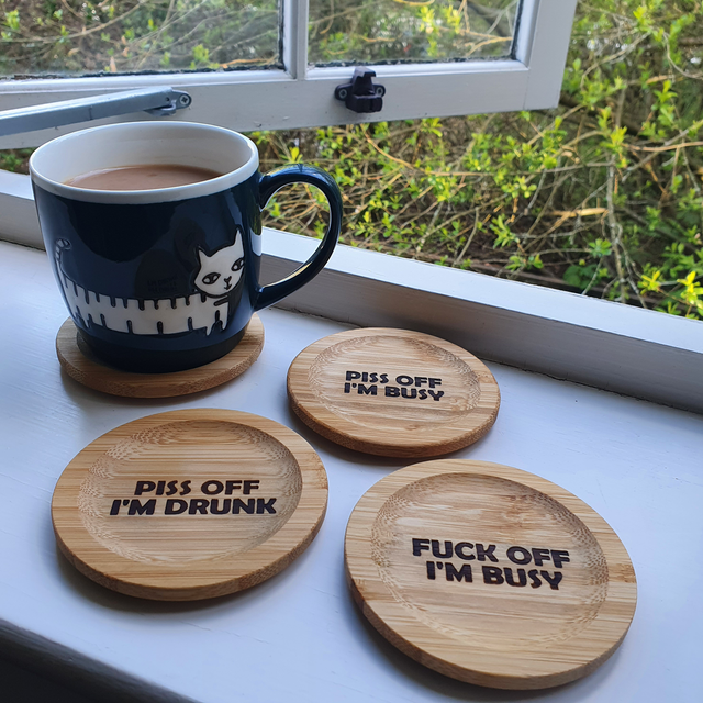 “F*** OFF/P*** OFF I’M BUSY” Bamboo Coasters/Cup Lids